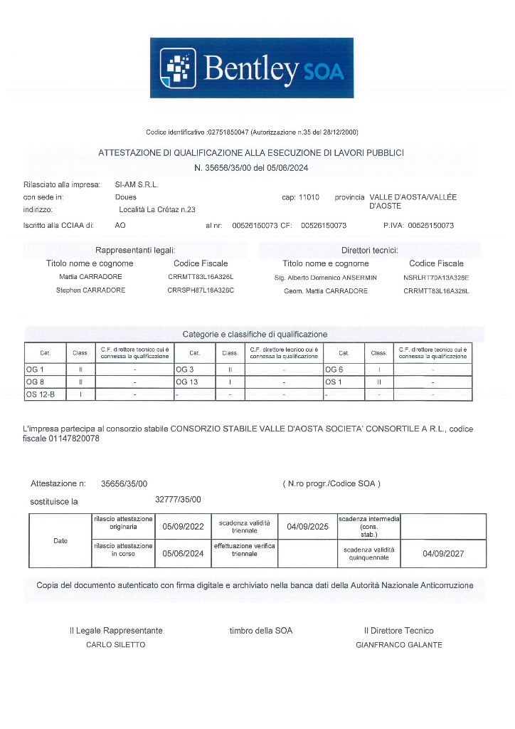 L’IMPRESA EDILE SI-AM SRL possiede l’Attestazione di qualificazione SOA n° 35656/35/00 rilasciata dalla Bentley SOA SPA nelle seguenti categorie e classifiche